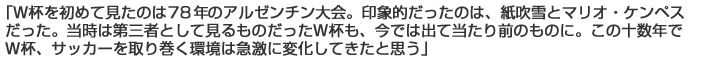 「初めて見たのは78年のアルゼンチン大会。確か『三菱ダイヤモンドサッカー』でやっていたのかな。当時小学校6年生でサッカーを始めたばかりの頃だったので、まだサッカーのことについては、あまり分かっていなかった。ただ、決勝のアルゼンチン対オランダ戦のスタジアムが超満員に膨れ上がり、ピッチが紙吹雪で覆われていたのは、すごく印象に残っている。それから、優勝したアルゼンチンのストライカーだったマリオ・ケンペスの活躍はよく覚えているし、オランダにいたアーリー・ハーンという選手が凄いロングシュートを決めたのも記憶に残っている。でも、 “ W杯 ” という意識よりは “ これが世界のサッカーだ! ” みたいな感じだったと思う。決勝で敗れたオランダがその前の大会で素晴らしいサッカーを披露していたことも知らなければ、のちにレッズで一緒に(選手とコーチという立場で)仕事をすることになったビム・ヤンセン(オランダ代表として74年、78年大会に出場)が出ていたこともまったく知らなかったからね」